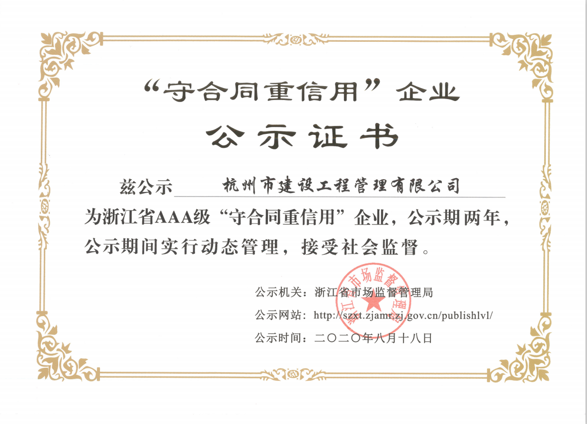 9U.COM建设工程管理有限公司荣获2020年浙江省AAA级“守合同重信用”公示证书,不仅证实了杭建“不信不立,不诚不行”一诺千金的企业行为,而且证明了杭建人在砥砺前行的道路上工作井然有序与有条不紊,我们将坚持以严谨的工作态度、实事求是、科学公正的立场,致力于招标代理和造价咨询事业。公司全体员工衷心感谢广大新老客户对公司发展的支持和帮助!